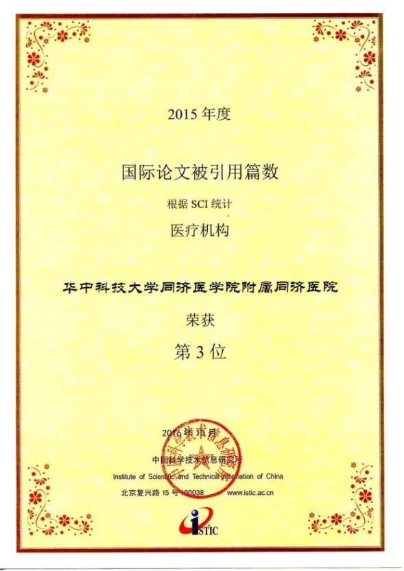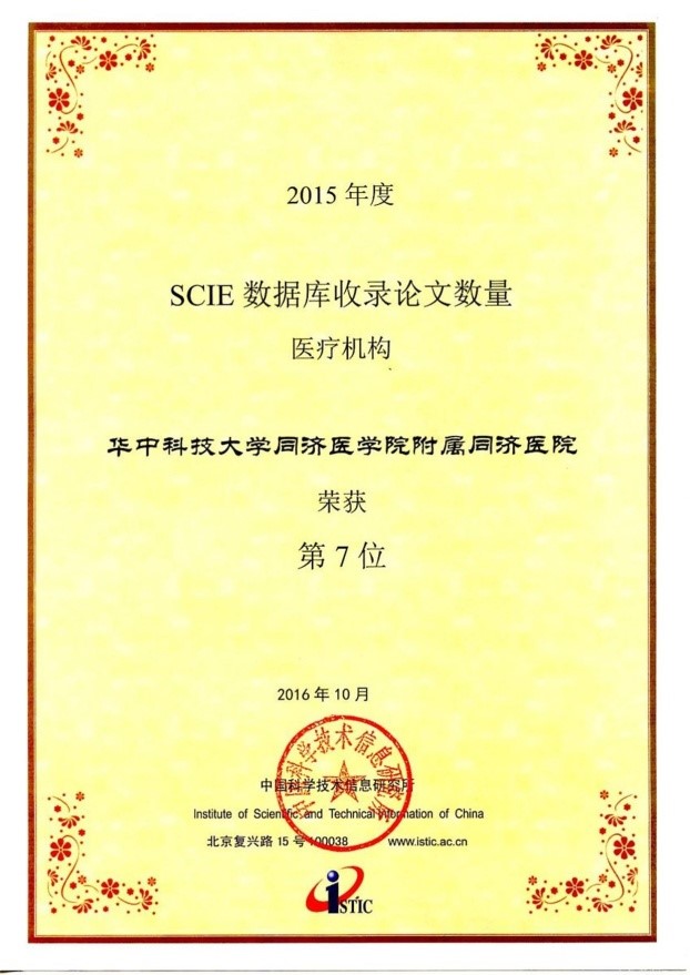 2016年10月12日,中国科学技术信息研究所在北京发布了2015年度中国科技论文统计结果。统计显示,我院2015年度SCIE数据库收录论文数量、国际论文引用篇数及引用次数等指标在全国医疗机构排名中稳居前列,居华中地区榜首。