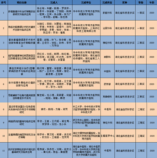 会上,2020年度湖北省科学技术奖励正式揭晓,共授奖327项。同济医院喜获11项奖项,其中作为第一完成单位获湖北省科技进步奖一等奖2项、二等奖4项、三等奖1项;作为合作单位,荣获湖北省自然科学奖二等奖1项、湖北省科技进步奖三等奖3项。