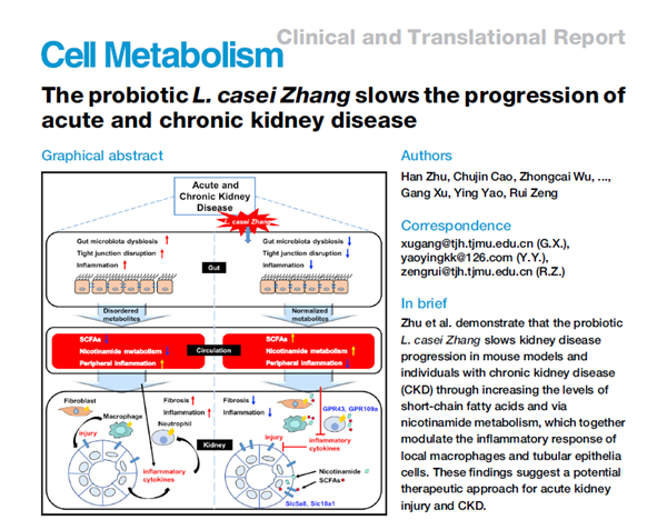 北京时间7月15日23时,国际著名学术期刊《Cell Metabolism》(该期刊2020年影响因子为27.287)发表了同济医院肾内科、临床营养科研究团队这一最新研究成果:益生菌干酪乳杆菌Zhang延缓急、慢性肾脏病进展。肾内科朱菡医师、曹楚瑾博士为共同第一作者,姚颖教授、徐钢教授和曾锐副教授为共同通讯作者。
