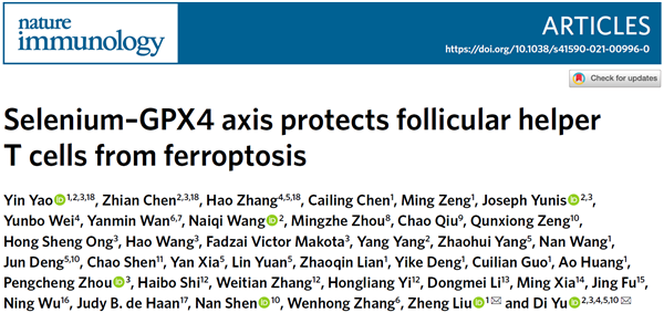 近期,《自然·免疫》杂志在线发表了华中科技大学附属同济医院耳鼻咽喉头颈外科刘争教授团队和昆士兰大学余迪教授团队题为《硒-硒蛋白GPX4轴保护滤泡辅助性T细胞免于铁死亡》的文章。文章指出,铁死亡是TFH细胞的主要死亡方式。文章第一作者为同济医院耳鼻咽喉头颈外科姚银博士,共同第一作者为昆士兰大学陈之岸博士和山东省分析测试中心张浩博士。余迪教授和刘争教授为共同通讯作者。