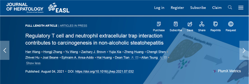 2021年8月4日,同济医院消化内科优秀博士生王涵以第一作者,田德安教授与俄亥俄州立大学Allan Tsung共同通讯在Journal of Hepatology (IF=25.08)期刊上,在线发表题为“Regulatory T cell and neutrophil extracellular trap interaction contributes to carcinogenesis in non-alcoholic steatohepatitis”的研究论文。该研究重点阐述了非酒精性脂肪肝中中性粒细胞诱捕网和调节性T细胞(Tregs)之间的交互作用抑制肿瘤免疫监视从而促进其向原发性肝癌发生发展的现象及机制,为预防非酒精性脂肪肝向肝癌转换提供了新的思路。