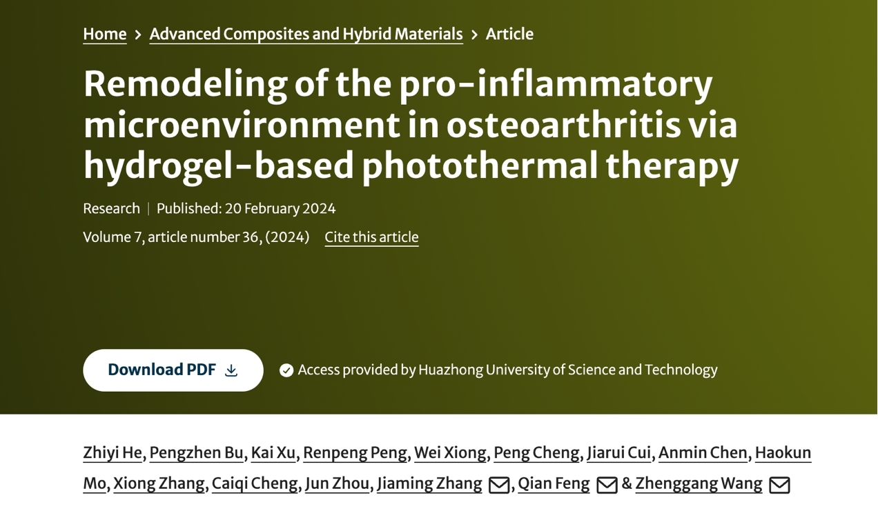 近日,华中科技大学同济医院骨科联合重庆大学、南方医科大学,开发了一种优化的可注射水凝胶用于骨关节炎的光热疗法,为骨关节炎的治疗带来了新前景。该项研究成果已在国际权威杂志《先进复合材料和混合材料》上发表。同济医院骨科博士生何直益、重庆大学卜鹏真、华中科技大学徐凯为论文共同第一作者,同济医院骨科王正刚医师、重庆大学冯茜教授、南方医科大学张家明教授为论文共同通讯作者。