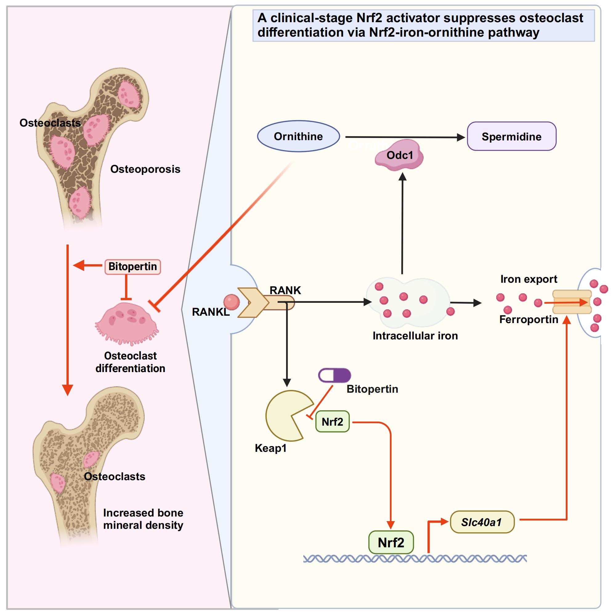 李锋教授团队此项研究发现,新型Nrf2激活剂Bitopertin能够通过上调Slc40a1基因(编码铁转运蛋白)的表达来促进铁外排,从而降低细胞内的铁水平。细胞内铁水平是破骨细胞分化和功能的关键因素,其含量在破骨细胞分化的过程中升高。通过降低铁水平,Bitopertin能够有效地抑制破骨细胞的分化,从而减少骨质疏松症的发生。