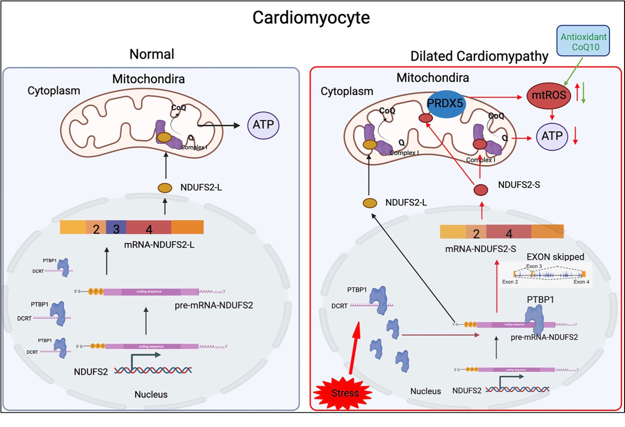 在分子机制方面,研究团队发现长链非编码RNA DCRT通过与蛋白PTBP1相互作用,阻止NDUFS2重组蛋白进行外显子跳跃剪接,减少线粒体活性氧的产生,维持心肌细胞线粒体稳态,从而保证心肌细胞的收缩功能。此外,通过腺相关病毒rAAV9介导的心肌细胞长链非编码RNA DCRT过表达,可以阻止NDUFS2重组蛋白进行外显子跳跃剪接,从而降低心脏氧化应激水平,为扩张型心肌病的防治提供了新的靶点。同时,应用CoQ10等抗氧化剂可以部分改善长链非编码RNA DCRT减少引起的线粒体失稳态和心功能障碍,为扩张型心肌病的治疗提供了新策略。