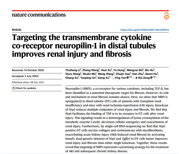 研究团队进一步发现,通过阻断NRP1和TGF-β的相互作用,可以显著改善肾损伤和纤维化。这一发现为临床治疗AKI和CKD提供了新的治疗靶点,为患者带来了新的希望。临床研究显示,NRP1是接受肾脏移植后出现肾功能障碍患者肾功能下降的独立危险因素,针对NRP1的干预可能成为慢性肾脏疾病的一种有前景的治疗策略。