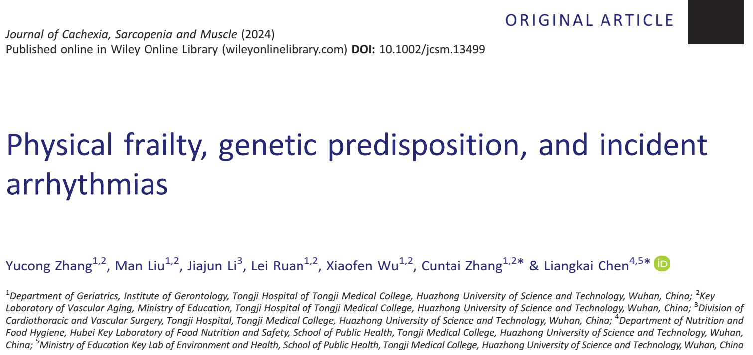 近日,华中科技大学附属同济医院老年医学科、血管衰老教育部重点实验室张存泰教授团队利用英国生物样本库的前瞻性队列,对50万英国社区人群进行筛选,研究证实,积极应对和管理衰弱状态,可以有效预防老年人的心律失常问题,减少因心律失常控制不佳导致的低血压、血栓栓塞、休克等严重并发症,特别是对于具有房颤遗传易感性的高危人群。