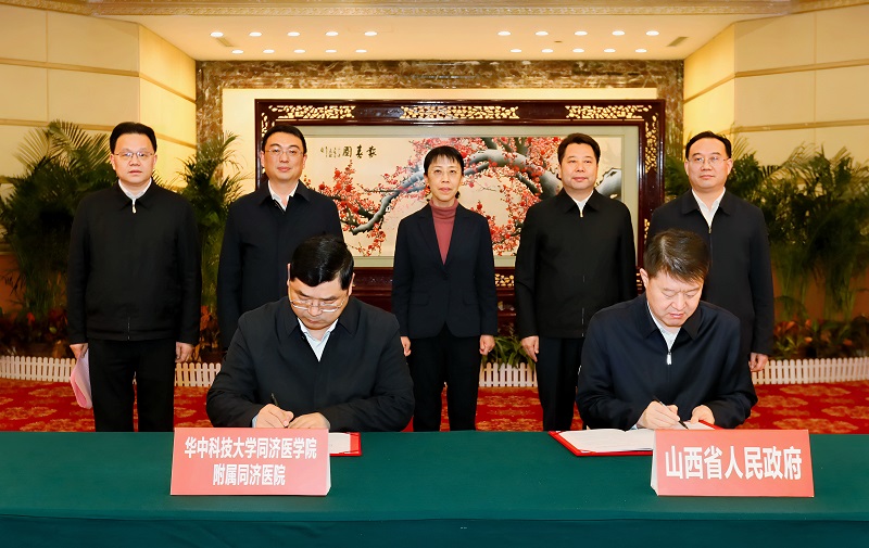 山西省卫健委党组书记、主任张波与同济医院党委副书记、院长胡俊波签署协议。山西省副省长赵红严、湖北省副省长蔚盛斌、华中科技大学副校长高亮、湖北省卫健委党组成员、副主任王云甫、同济医院党委书记唐洲平见证签约。