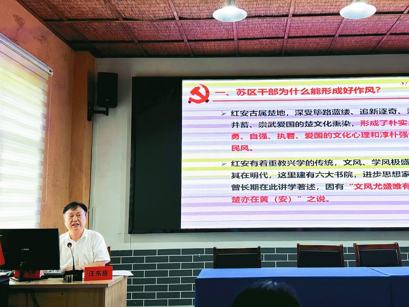 湖北大别山革命传统教育基地副主任汪东应通过鲜活的革命人物及故事向党员同志娓娓讲述《苏区干部好作风》的形成基础、作风类型及时代意义,他认为传承优良作风应坚持“钉钉子”精神,深化拓展清廉建设,才能将清廉守正、担当实干之风充盈神州大地。