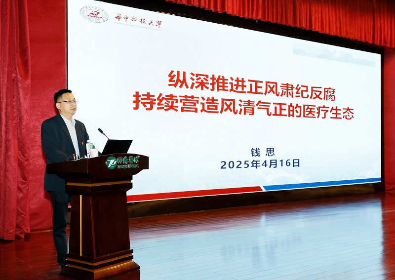 华中科技大学纪委副书记钱思同志出席会议并讲话。他传达了二十届中央纪委四次全会精神,分析了当前医药领域反腐败斗争的形势,结合相关典型案例剖析了医药领域腐败问题的八大突出表现,警示广大领导干部、医务人员要以案为鉴、以案为戒,守住底线。他强调,医院要持续加强重点领域监管,强化高压态势,扎紧制度笼子,加强纪律警示教育和医德医风教育,继承发扬医院优秀文化,纵深推进正风肃纪反腐。