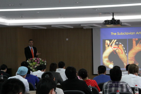 本次讲学的题目是“主动脉弓支架的植入——挑战,设计和技术”,为相关领域顶级技术之一。参会人数达百余人,包括我院血管外科、心血管内科、心血管外科、介入放射科、综合科(老年医学)20余位专家,以及省内10余位血管外科专家。讲学受到所有的专家学者的一致好评,对于国际腔内血管外科的发展有了更进一步的了解。
