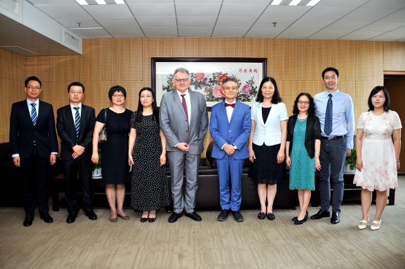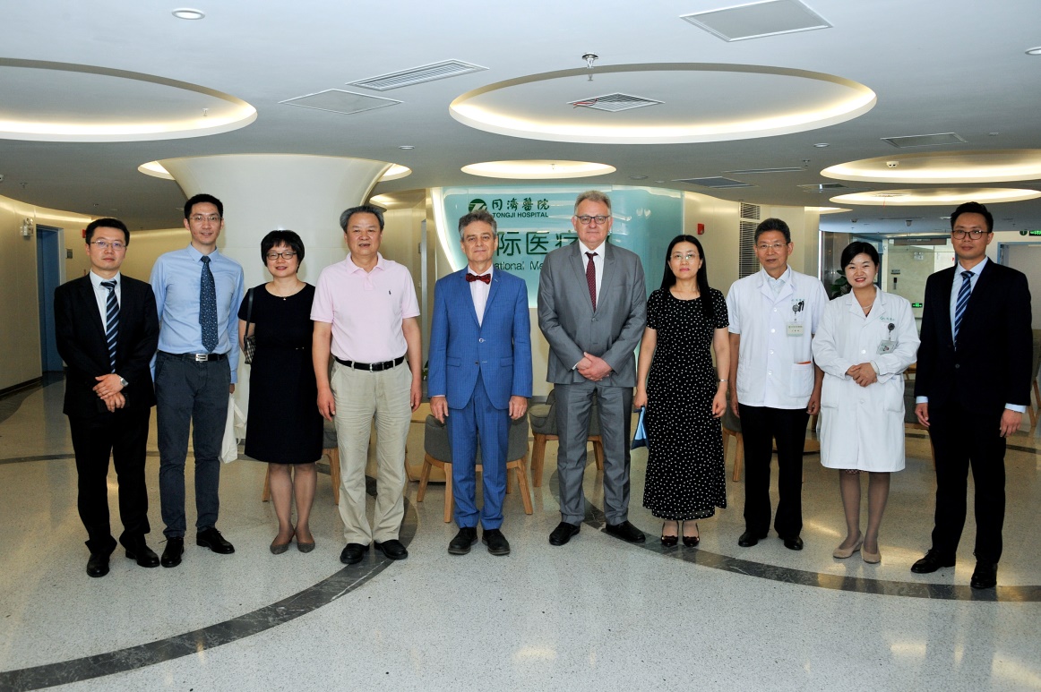 2019年7月17日9点,法国驻武汉总领事馆总领事贵永华先生、科技专员穆和颜先生和科技处项目官员李珊珊女士一行三人到同济医院访问。华中科技大学副校长,同济医学院院长陈建国、同济医院党委书记吴菁、副院长朱文珍、华中科技大学国际交流处和同济医院国际交流办的相关领导在同济医院行政楼接待了外宾一行。同济医院感染科主任宁琴教授,综合医疗科主任张存泰教授以及同济医院留法留法青年医师一同参与了接待。