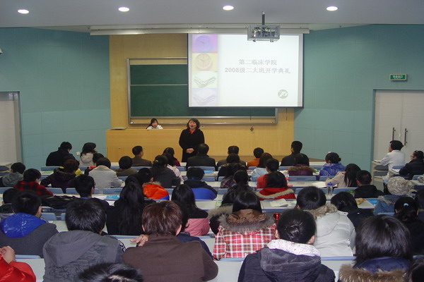 第二临床学院2008级二大班开学典礼于2011年2月20日晚7:00在三大教室举行。出席典礼的有党总支宋静书记、杨伯凡副书记、分团委杨帆书记、奚哲老师、教学办公室陈琢主任、万宝俊副主任、谭飞副主任以及基础医学院党总支周新宇副书记、周觉民主任、胡小川老师及2007级德医、2008级临床医学、2008级中医和2008级口腔班全体同学。