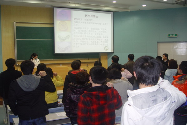 同学们随后观看了同济医院院史片《穿越世纪的腾飞》,这使同学们对同济医院的光辉历史有了详尽的了解,也激励他们以同济的先辈们为榜样,积极进取,将同济的精神永久的传承下去。