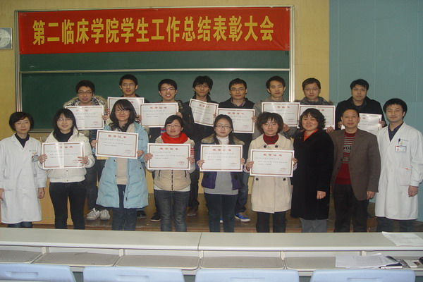 首先,宋静书记作了2010年学生工作的总结报告,肯定了2010年第二临床学院学生工作所取得的突出成绩,并鼓励同学们能再接再厉,取得更好的成绩。接着,杨帆老师宣读了表彰决定,包括优良学风班13个、校三好学生26人、校优秀学生干部26人、学习优秀奖学金38人、自强奖学金37人、学习进步奖学金24人、文体活动奖学金31人、“求是杯”全校大学生课外学术科技作品竞赛三等奖10人、启明读书优秀读书心得获奖者3人以及院系奖励资助获奖者6人。大会最后,与会领导为获奖同学及班集体代表进行颁奖。