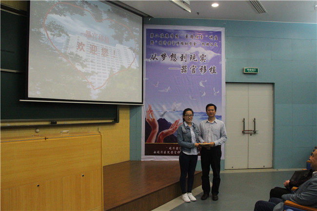活动开始,器官移植党支部书记张伟杰教授介绍器官移植助学金的基本情况,让在场学生了解助学金的来源、意义、评选程序和条件,随后将资助金颁发给受助学生马先桃同学,把希望送到学生的手中,鼓励学生努力学习。发放完毕后,受助学生上台发言,用平实质朴的语言表达了对器官移植助学金的感谢和对自己未来的一个承诺,受助学生激扬的发言感染了在座的每一个人,有梦就可以去追。
