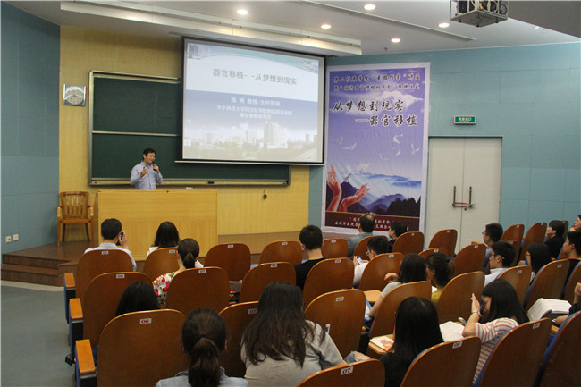 捐赠仪式结束之后,器官移植研究所博士生导师陈刚教授做了题为:“从梦想到现实——器官移植”的讲座,从《列子》中神医扁鹊为人换心脏以治疗疾病的故事开始讲述人类久远的梦想,到20世纪50年代美国科学家Murray第一个在同卵孪生子中进行肾移植活获得成功并长期存活使人类的这一梦想成了现实,再到同济医院器官移植的发展历史和现状,为同学们讲了人类在器官移植这一领域探索的脚步,让学生们看到了一支实力雄厚的医疗队伍在中国器官移植领域做出的重大贡献,坚定了有志从事器官移植的同学们的决心。陈教授语言风趣、资料翔实,教室内思维的碰撞让同学们激情满怀。