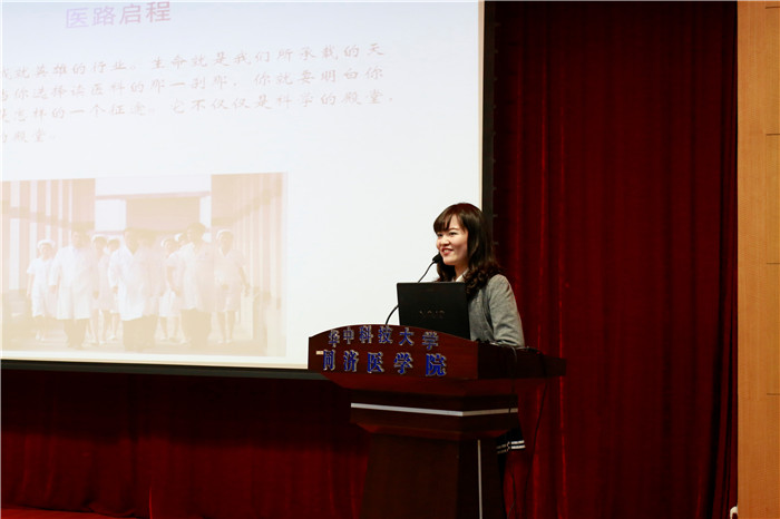 “医生就是成就英雄的行业,生命就是我们所承载的天降大任。当你选择读医科的那一刹那,你就要明白你所踏上的是怎样的一个征途。它不仅仅是科学的殿堂,更是社会的殿堂”,来自第二临床学院的赵博闻以电视剧《心术》的经典语句作为演讲的开头,慷慨激昂的措辞配合铿锵有力的背景音乐,成功吸引了评委与现场观众的关注。她的演讲由三部分组成:医路启程、同舟共济、实践出真知,讲述了自己在这五年医学旅程中的经历与感悟。赵博闻同学首先和大家分享了她报考临床医学时的坚定与执着,进而通过回顾同济医学院的校史和自己的学习经历,表达了对“同舟共济”精神的理解与体会,内容详实,情感真切,富有感染力。