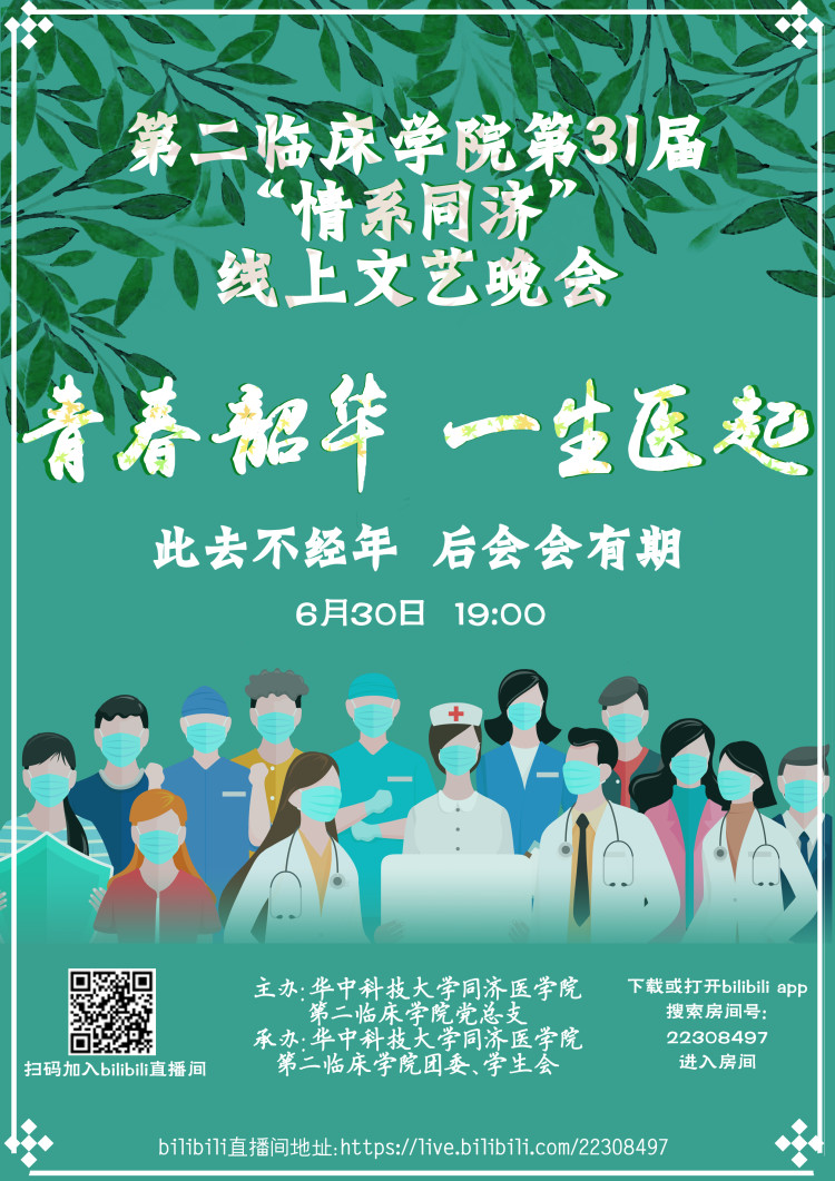 2020年注定是不平凡的一年,新冠来袭,医护奋勇当先,不负青春韶华。2020年6月30日晚7点整,第二临床学院举办了以“青春韶华,一生医起”为主题的线上文艺晚会,旨在传承身处疫情中心的老师们无论报酬、不计生死的职业信仰,表现同学们面对疫情积极乐观的精神风貌。晚会以网络直播的方式播出,第二临床学院6000余名师生及校友在线观看。