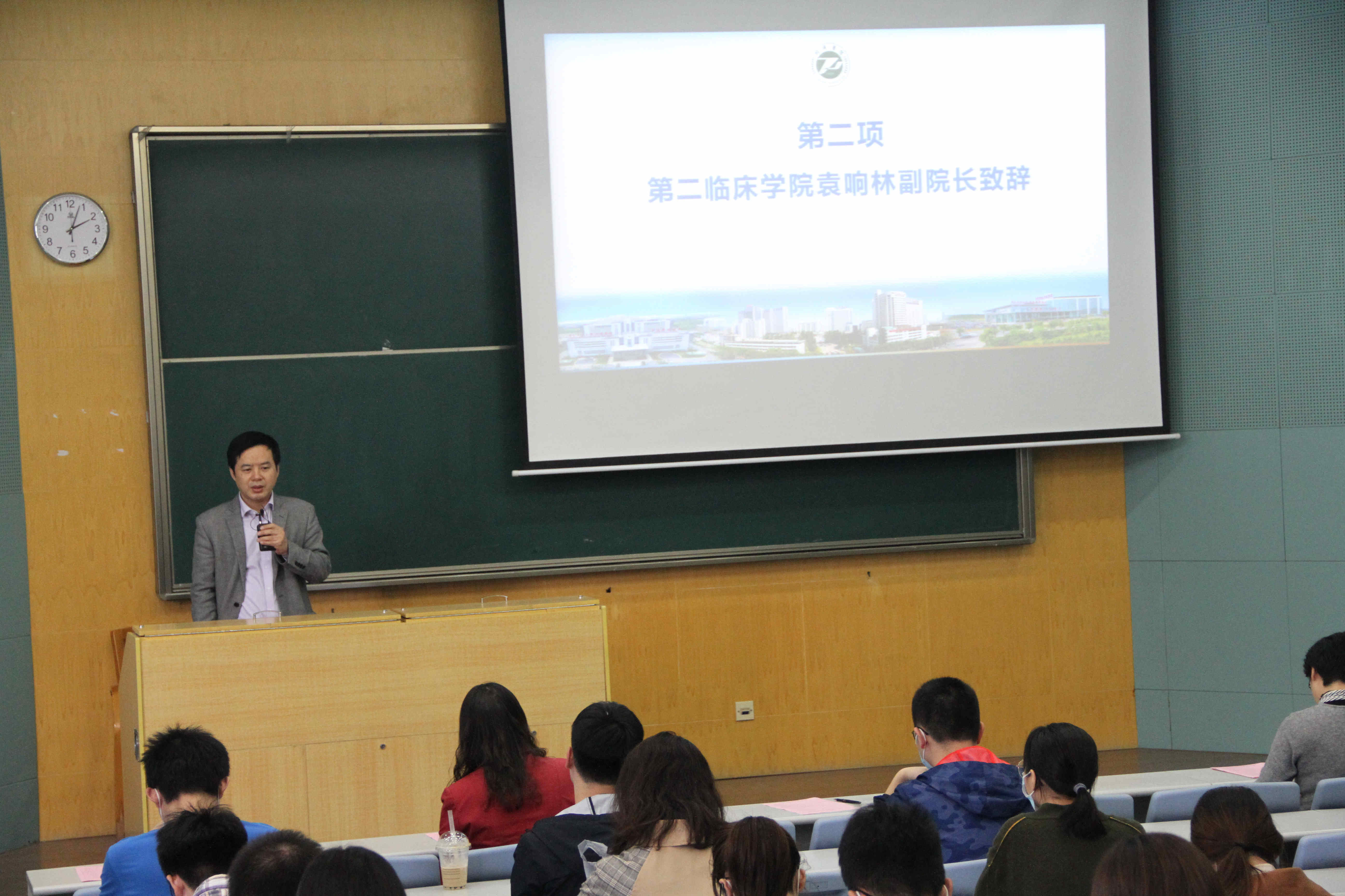 庄严的义勇军进行曲结束后,第二临床学院袁响林副院长致辞,他对第二临床学院以往的学生会工作予以了充分肯定,用自己的学医、从医、抗疫经历,勉励全体学生代表和主席团候选人,弘扬与国家同舟、与人民共济的同济精神,学好专业,服务好同学,在党的领导下,成为社会主义事业的合格建设者和可靠接班人。