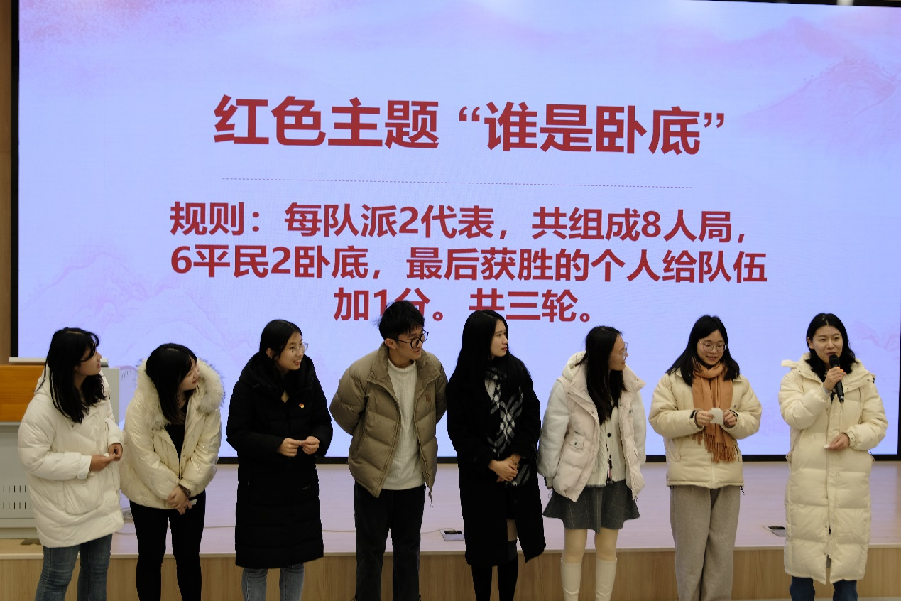 本次政治生日会特别设置了红色主题“谁是卧底”“看图猜剧名”“你画我猜”等多轮趣味党史比赛。全体党员分为四队进行比拼,最终以第一队的胜利为这次趣味竞赛画上圆满句号。以形式促内容、以竞争促学习,此次比赛不仅展现了支部党员的政治学习成果和友好竞争风采,更使主席语录、革命精神、党史知识和相关优秀文艺作品得到普及、深入人心。