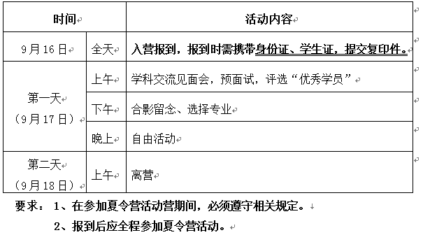 对所寄报名材料核准后,9月5日前将在网上公布夏令营学员录取结果,同意录取的学生请按照日程安排的要求按时报到。如因特殊情况不能参加本次夏令营,请于9月10日前告知主办单位。