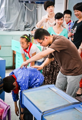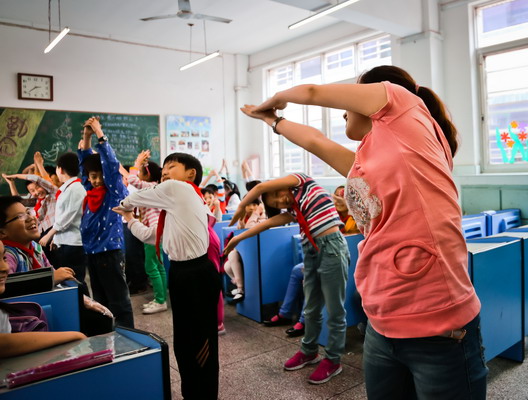 本次活动一共由小讲课、益趣游戏、学习健康操,脊柱侧弯普查四个部分组成。吴庆莲主持。在精彩的开场白后,祝文涛博士开始讲解脊柱侧弯相关知识。他生动幽默的讲解,乐趣横生的举例,惟妙惟肖的肢体动作,把同学们乐得哈哈大笑,同学们也积极回答着祝博士的提问,一个个手举得老高老高,同学们的热情和积极完全超乎了大家的想像,还时不时被同学们“无厘头”的答案乐得人仰马翻!