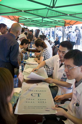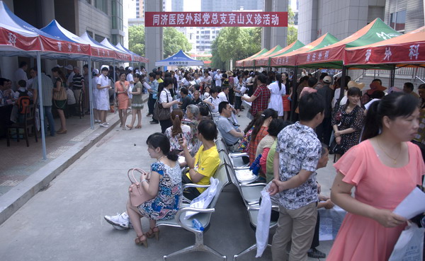 医疗队于早7时由同济医院出发,并于上午九时抵达京山县人民医院,在经过简单而隆重的欢迎仪式后,正式拉开了本次义诊的序幕。在当地医院积极配合下,提前发出公告:同济外科专家医疗队要来开展义诊活动,当地群众早已在医院等候这次难得的便民就诊机会。每位专家的就诊号已预约了40多个。