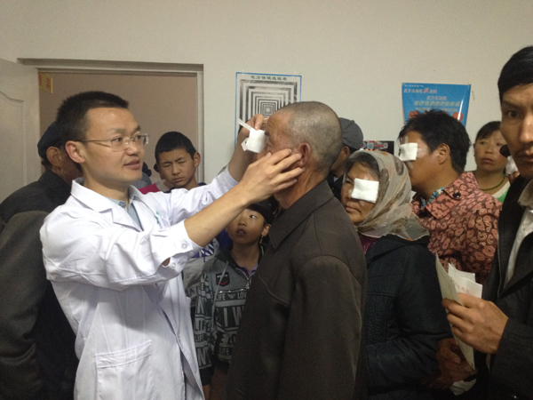 找到问题的症结后,王医生有针对性地拟定了工作计划:(1)利用本次复明工程的机会,设计“高原地区白内障复明手术效果”临床课题,指导当地医生进行课题设计、开展及论文的撰写,借此提高基层医生总结病例经验的意识;(2)结合当地的实际与防盲队的要求,制定了白内障筛查的标准,以确保手术安全、顺利地进行;(3)自己主动承担部分筛查工作,让本院的两位医生轮流进手术室,观摩学习手术;(4)适当的时候,与山东防盲队展开交流学习。 计划制定,马上实施。为了保证病例总结的客观性,在筛查病人的过程中,王医生严格把关,遇到复杂病例,与当地医生共同讨论,保证了所搜集病例数据的准确性;为了保证病人的手术安全及项目的顺利实施,王医生对每一名患者反复检查,仔细斟酌,并在病历上写上建议手术方案,供手术医生参考;为了减轻当地医生负担,让他们有时间进手术室观摩学习,他主动承担了部分筛查工作,经常错过“饭点”;在筛查工作结束后,他来到手术室,与防盲队领队——山东中医药大学附属眼科医院王院长进行了深入交流,与防盲队的另一位主刀医生并肩“战斗”、默契配合,仅半天时间两人各自完成了20例白内障超声乳化手术;在防盲队离开门源县的第二天,王军明医生还给当地医生亲自示范了几例特殊白内障手术及翼状胬肉手术。