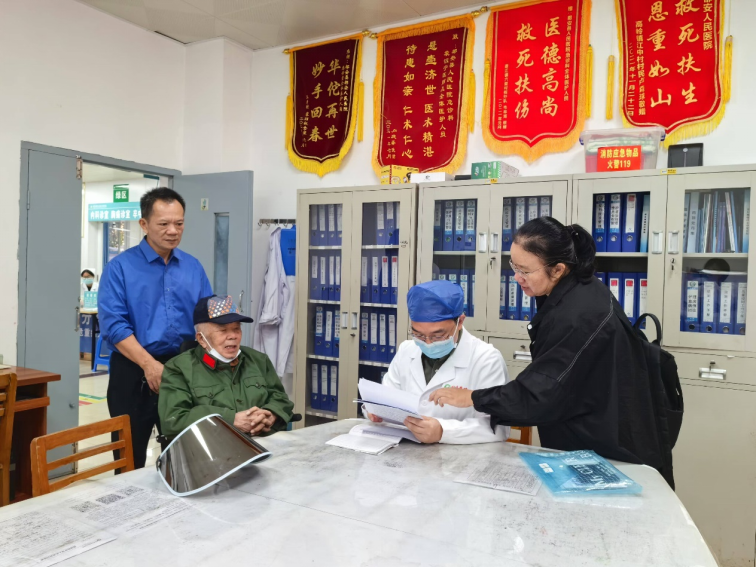 在下乡义诊期间,医疗队发现一位壮族抗美援朝烈属的曾孙,患有严重的地中海贫血15年,反复输血治疗150余次。医疗队队长汇报医务处后,院党委高度重视,组织我院多学科的精兵强将,顺利为这名患者召开了远程多学科会诊。党委副书记廖家智携医务处、血液科、输血科、营养科、护理部听取病情汇报后给予了分析和指导意见。