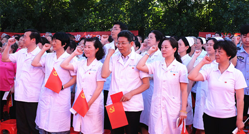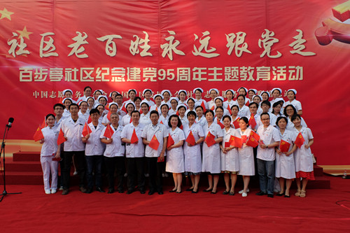 6月17日下午,华中科技大学附属同济医院综合医疗科60余名在职党员与百步亭社区5000多位党员、居民齐聚一堂,佩戴党徽,唱《国歌》、重温入党誓词、合唱革命歌曲,开展“社区老百姓永远跟党走”唱爱国爱党歌曲、讲党员故事、送关爱系列活动,共庆建党95周年。