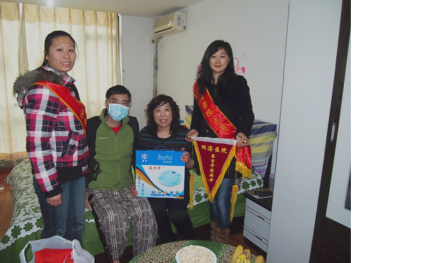 为了响应医院的志愿服务号召,2013年2月11日我们器官移植志愿者服务队一行八人来到了硚口区金叶国际,为一名胰肾联合移植术后的病人——樊飞提供护理服务。