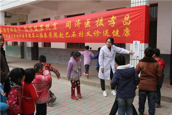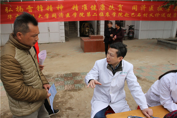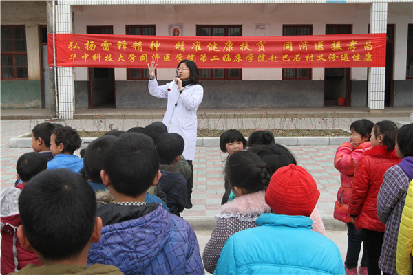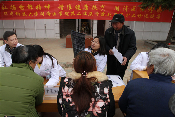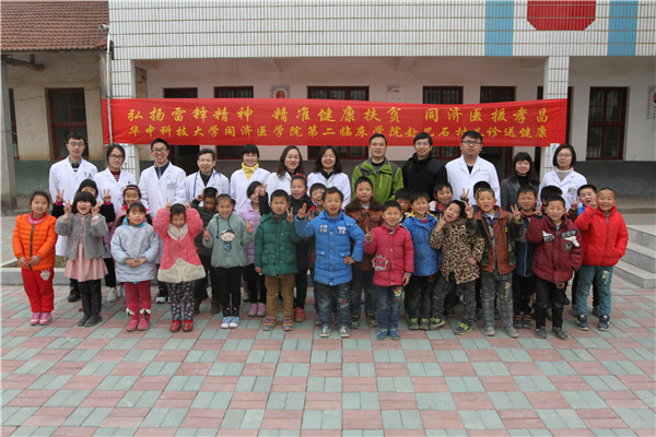 2016年3月3日,第二临床学院的师生们赴华中科技大学精准扶贫点孝昌县王店镇巴石村开展“弘扬雷锋精神,精准健康扶贫,同济医援孝昌”活动。针对当地以孤寡老人和留守儿童为主的特点,特别邀请同济医院周琦副教授,黄冬梅副教授,黄永建副教授前往,同行的还有第二临床学院宋静书记等多位老师及学生们。