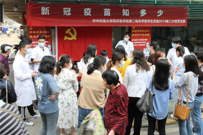 5月13日上午,同济医院(华中科技大学同济医学院第二临床学院)2016级二大班党支部全体党员赴站邻社区开展“新冠疫苗知多少”知识宣传活动。