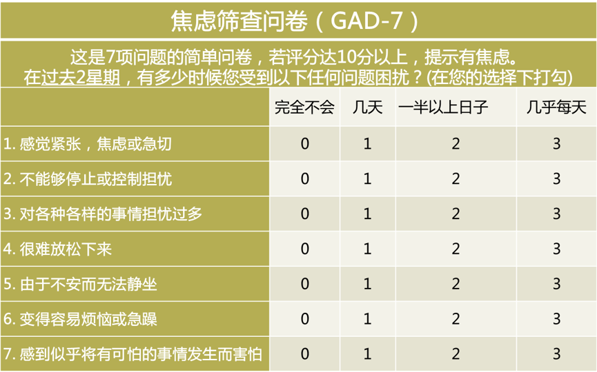 如果您觉察到焦虑、恐惧、担心、无助无望的情绪强烈且无法消除,或出现明显的睡眠问题,请及时找到专业医生咨询。咨询前先做焦虑抑郁量表初步评估。