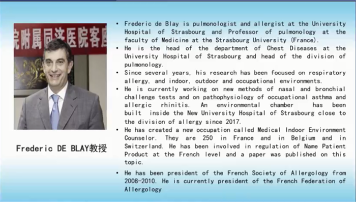 法国斯特拉斯堡大学医院胸科主任Frédéric De Blay教授就过敏临床研究的新工具-环境暴露室、过敏原标准化以及临床使用进行了专题讲座。