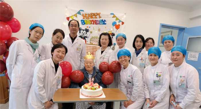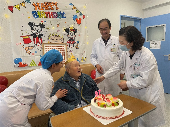 生日当天,王伟书记代表同济医院全体医护人员向张老问好,他详细了解张老病情和精神状态,为张老送上百寿图,寓意益寿延年。综合医疗科涂玲书记代表医护人员动情地说道:“听您的话,一辈子跟党走,做个好医生!”大家一起点亮生日蜡烛,齐声唱响生日快乐歌,用歌声传递着对张老的关爱和祝福。欢声笑语中,张老脸上洋溢着幸福的笑容,感动地说“谢谢你们!大家都快乐!”