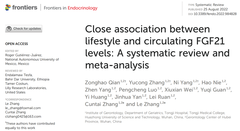 近期,华中科技大学同济医学院附属同济医院张存泰、张乐教授研究团队在《内分泌学前沿》(《FrontiersinEndocrinology》)杂志上发表题为“Close association between lifestyle and circulating FGF21 levels: A systematic review and meta-analysis”的荟萃分析论文(图1)。该研究共纳入50项临床研究,囊括总共1438位受试者,研究发现血清FGF21水平与生活方式密切相关,可以作为衡量不同生活方式对健康影响的标志物。老年医学科钱宗昊硕士、张宇聪医生、杨妮博士为共同第一作者,张存泰教授、张乐副教授为通讯作者。
