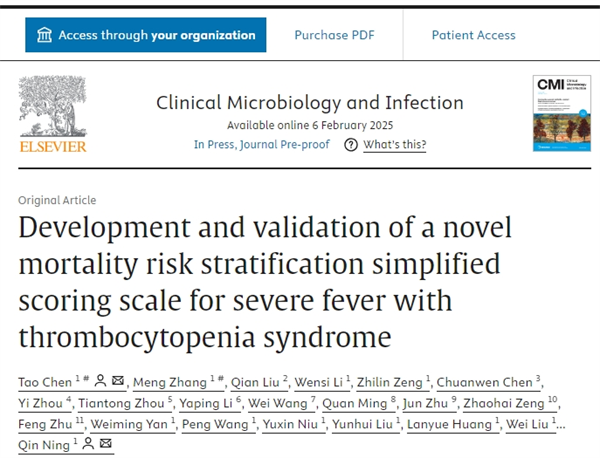 2月6日,华中科技大学附属同济医院、人畜共患传染病重症诊治全国重点实验室宁琴教授、陈韬团队,在国际知名期刊《Clinical Microbiology and Infection》上发表了一篇具有里程碑意义的研究论文——《Development and validation of a novel mortality risk stratification simplified scoring scale for severe fever with thrombocytopenia syndrome》。