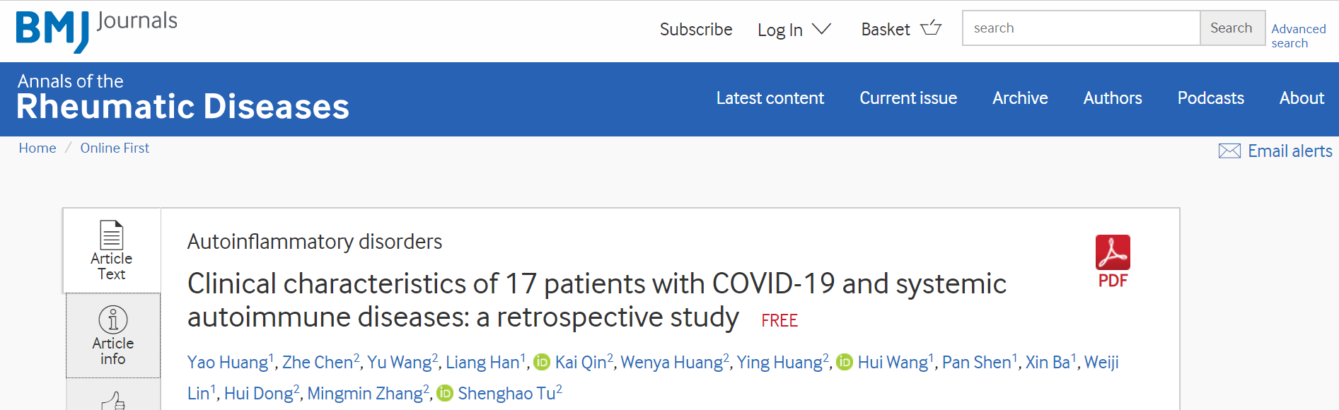 《风湿病年鉴》刊发论文,揭示新冠肺炎合并系统性自身免疫性疾病的临床特征