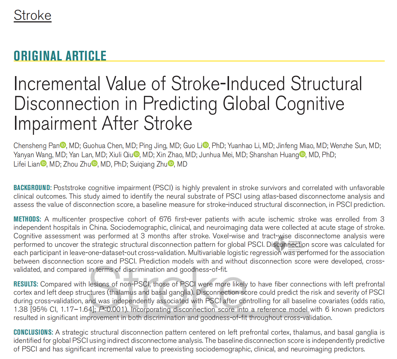 华中科技大学附属同济医院神经内科朱遂强教授、朱舟教授团队牵头前瞻性多中心临床队列研究,原创性地采用了基于图谱的间接结构失连接组分析,从脑网络角度提出“失连接评分”作为预测卒中后认知障碍风险的重要指标。近日,该研究结果发表在国际领域顶级期刊《中风》上。