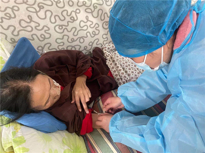 志愿者们在郭娟护士长的带领下,来到了家住在武昌的肖阿姨家。肖阿姨出院第6天,因担心她身体虚弱、出门不便,于是他们决定上门为她进行PICC置管维护,指导长期留置鼻肠管的注意事项等护理服务。
