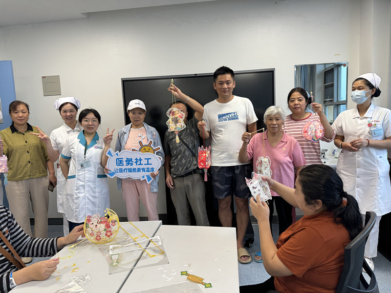 与此同时,活动室内也是一片欢声笑语。患者们在医护人员的引导下,亲手制作中秋花灯,现场洋溢着温馨和谐的氛围。