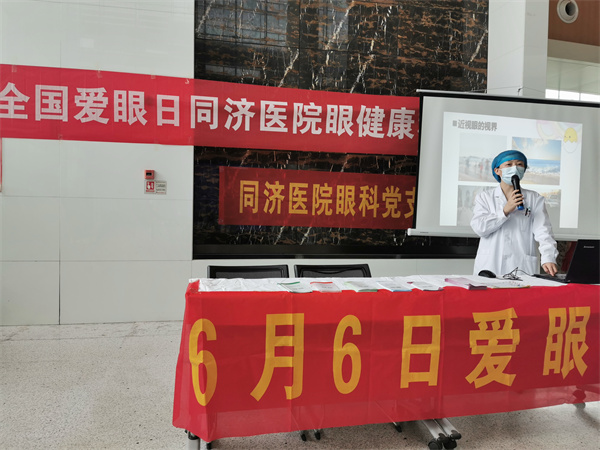 6月6日是第26个全国“爱眼日”,今年的主题是“关注普遍的眼健康”。为了增强全社会爱眼护眼意识,同济医院三院区在门诊大楼分别进行了近视防控、角膜病、白内障、青光眼等系列知识科普讲座。