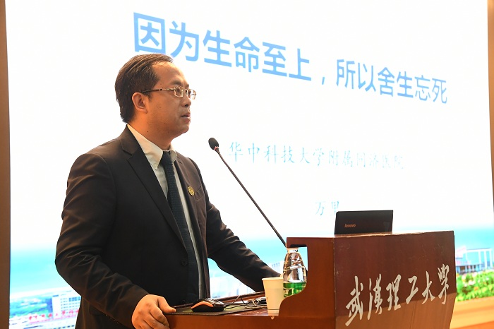 11月10日下午,受武汉理工大学邀请,“时代楷模”同济医院“尖刀连”中法院区插管小分队队长万里教授做客武汉理工大学“师德讲坛”宣讲抗疫精神,该校相关职能部门负责人和师生代表共200余人参加了报告会,副校长王世杰主持报告。