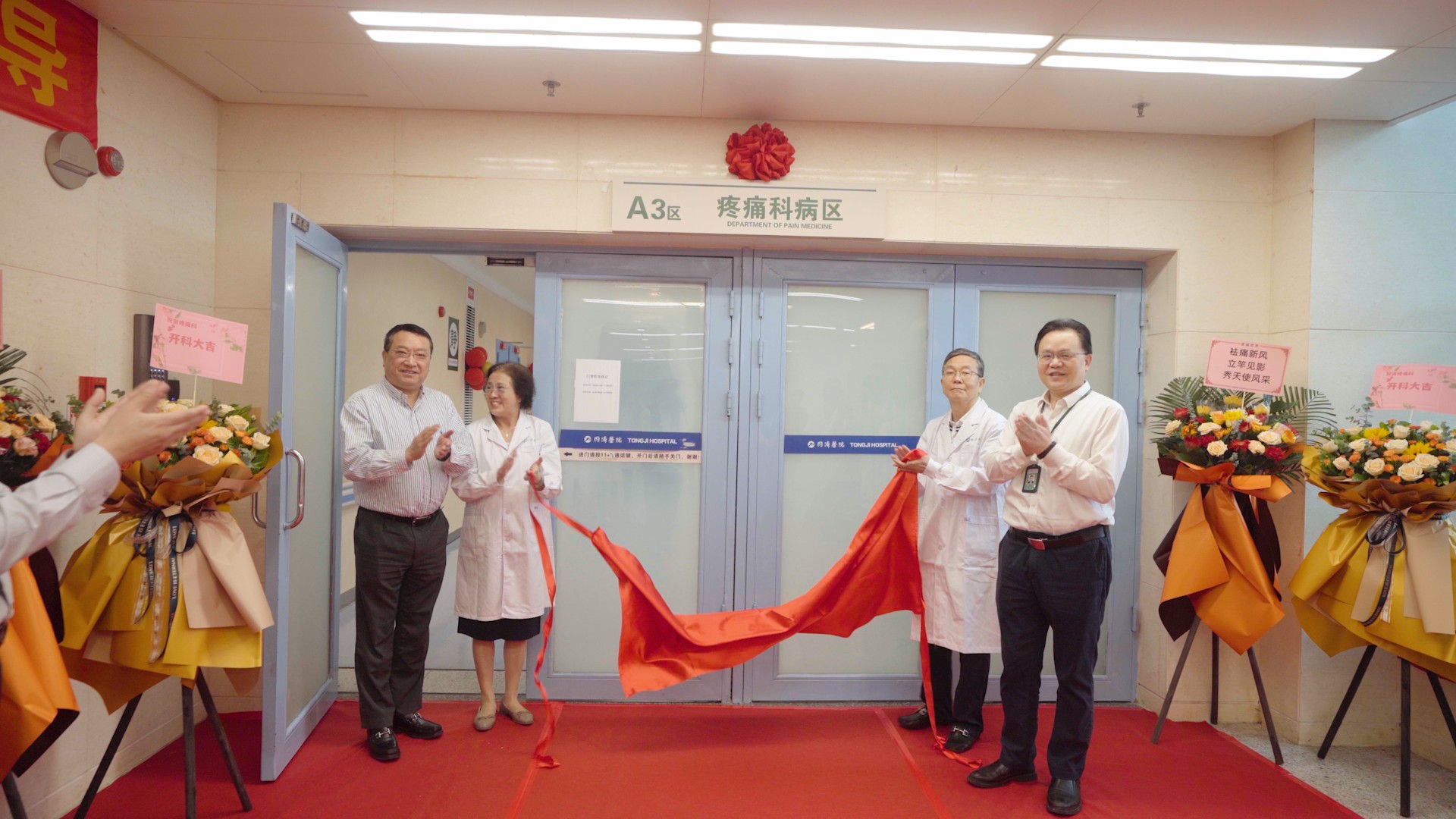 2023年6月6日下午,同济医院院长刘继红、副院长唐洲平与同济医院麻醉学教研室主任罗爱林、教授田玉科一道,为光谷院区疼痛科病区揭牌,祝贺疼痛科病区正式启用,能为更多饱受疼痛折磨的病人提供优质诊疗服务。
