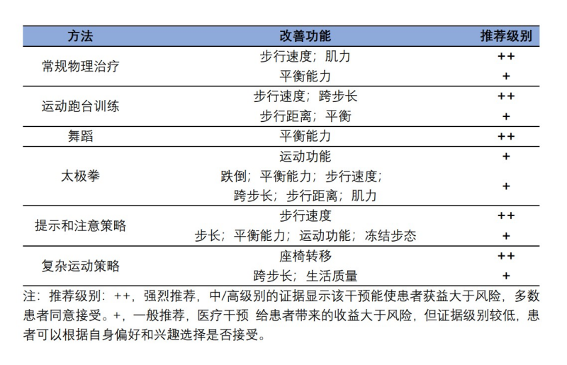 常规物理治疗主要包括步态、平衡、转移或体能训练,以及组合训练,要注意将功能和功能性活动相结合,至少训练 8 周,每周 3次,每次 45 min。