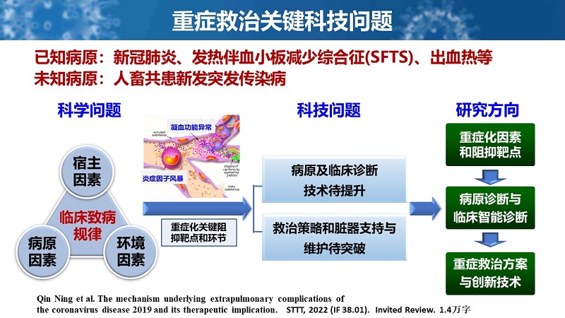 实验室以新发突发及重大经典人畜共患烈性传染病的重症救治作为主攻方向,以实现习总书记“探索新的治疗手段,尽最大可能阻止轻症患者向重症转化,切实提高治愈率:提升重症危重症救治水平,尽量降低病亡率”的重要指示作为奋斗目标。