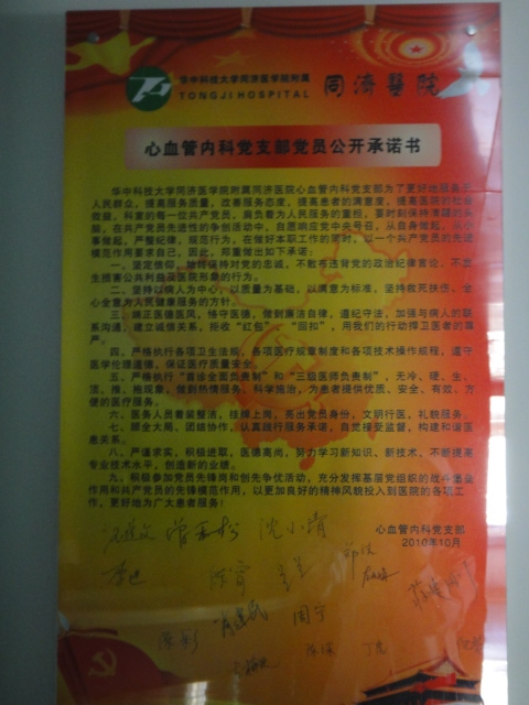 为进一步落实“创先争优”活动,贯彻执行院党委组织基层党建工作,心血管内科党支部积极行动,更好地服务于人民群众,提高服务质量,改善服务态度,提高患者的满意度,提高医院的社会效益。于10月底召开全体党员大会,写出公开服务承诺书,并以板报形式在心内7楼8楼以及心功能室张贴。我们公开承诺:每一位共产党员,肩负着为人民服务的重担,要时刻保持清醒的头脑,在共产党员先进性的争创活动中,自愿响应党中央号召,从自身做起,从小事做起,严整纪律,规范行为,在做好本职工作的同时,以一个共产党员的先进模范作用要求自己……全体党员积极踊跃签名。此项活动,受到患者们的一致好评,同时也让我们党员工作更加透明,更加阳光。