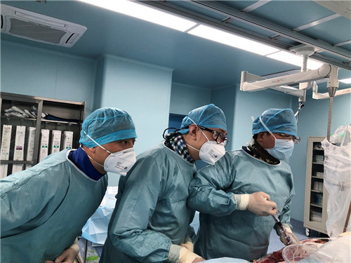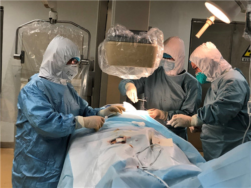 内科楼1号介入手术室,王炎教授(右一)、刘启功主任医师(右二)正在为患者装起搏器