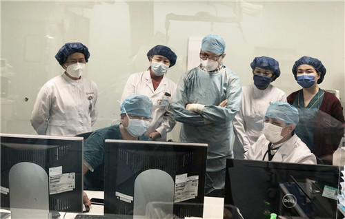 内科楼2号介入手术室,心内科曾和松教授(右一)、严江涛教授(右二)、